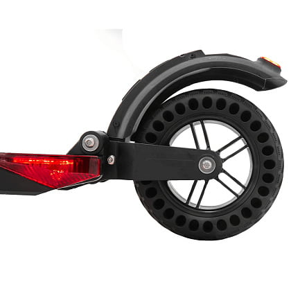 Колеса самоката — цельнолитые. Плюс таких покрышек в том, что их нельзя проколоть или повредить. Чтобы тряска от неровных дорог ощущалась меньше, в электросамокат GT S3 Pro добавили пружины с обеих сторон. Для устойчивости при выполнении трюков и поворотов, дека устройства покрыта наждачным материалом.