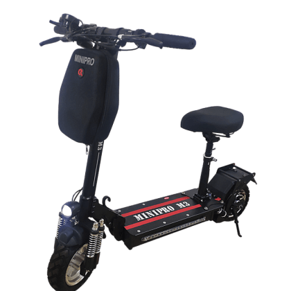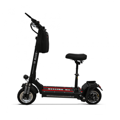 Рама электросамоката сделана из алюминия. Все крепления прочные — в зоне складного механизма руля и ручек нет никакого люфта. Весит M3 35 килограммов. Такой вес помогает MiniPro быть устойчивым на неровных дорогах. Сиденье идет в комплекте. Оно сделано из экокожи, очень большое и мягкое. Если вы захотите поездить стоя, его можно полностью убрать.