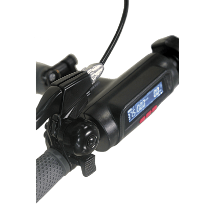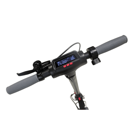 Аккумулятор установлен в деку, а мотор — в переднее колесо. Сочетание 8Ah аккумулятора и 250W двигателя разгонит вас до 25 км/ч. Разгон регулируется с помощью 3 режимов кнопками на руле. А для полной остановки можно использовать задний дисковый тормоз, рычаг которого расположен на руле.