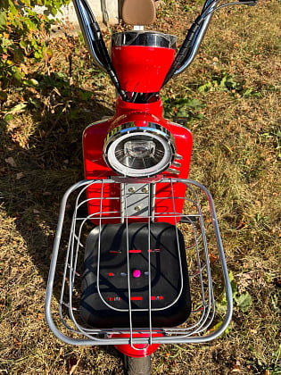 Электроскутер дополнительно оснащён педалями для начала движения или завершения, если заряд аккумулятора иссяк.
