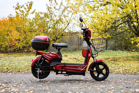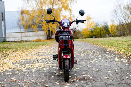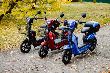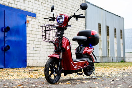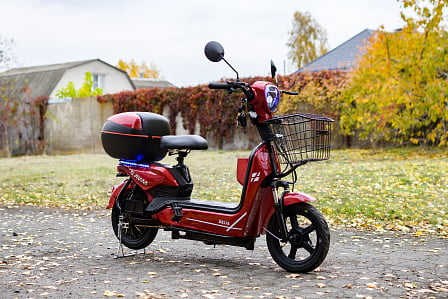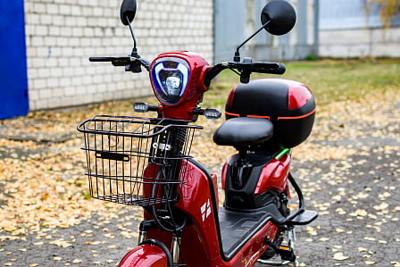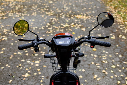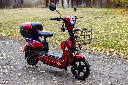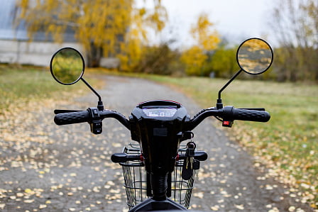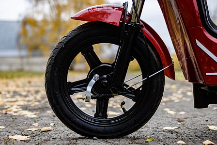 - Электроскутер оснащен барабанными тормозами, обеспечивающими надежное и безопасное торможение
