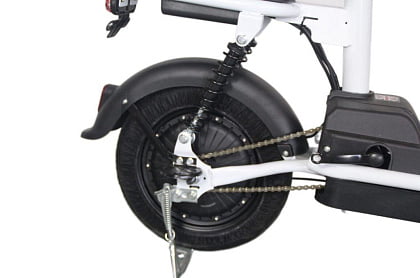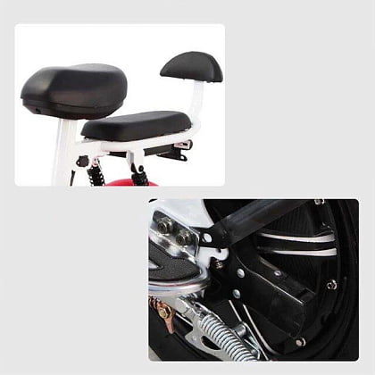 Имеет вместительную прямую платформу для ног, широкое и мягкое водительское сиденье и дополнительное мягкое сиденье со спинкой для пассажира. Прочная стальная рама рассчитана на максимальную нагрузку до 150 кг (выдержит двух взрослых человек).