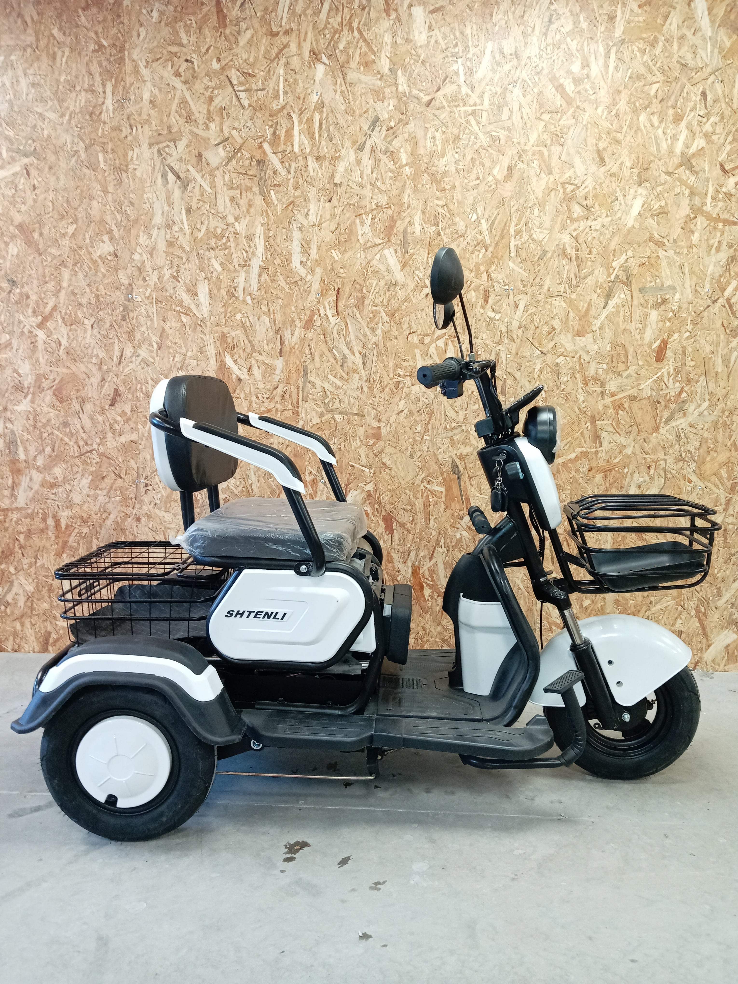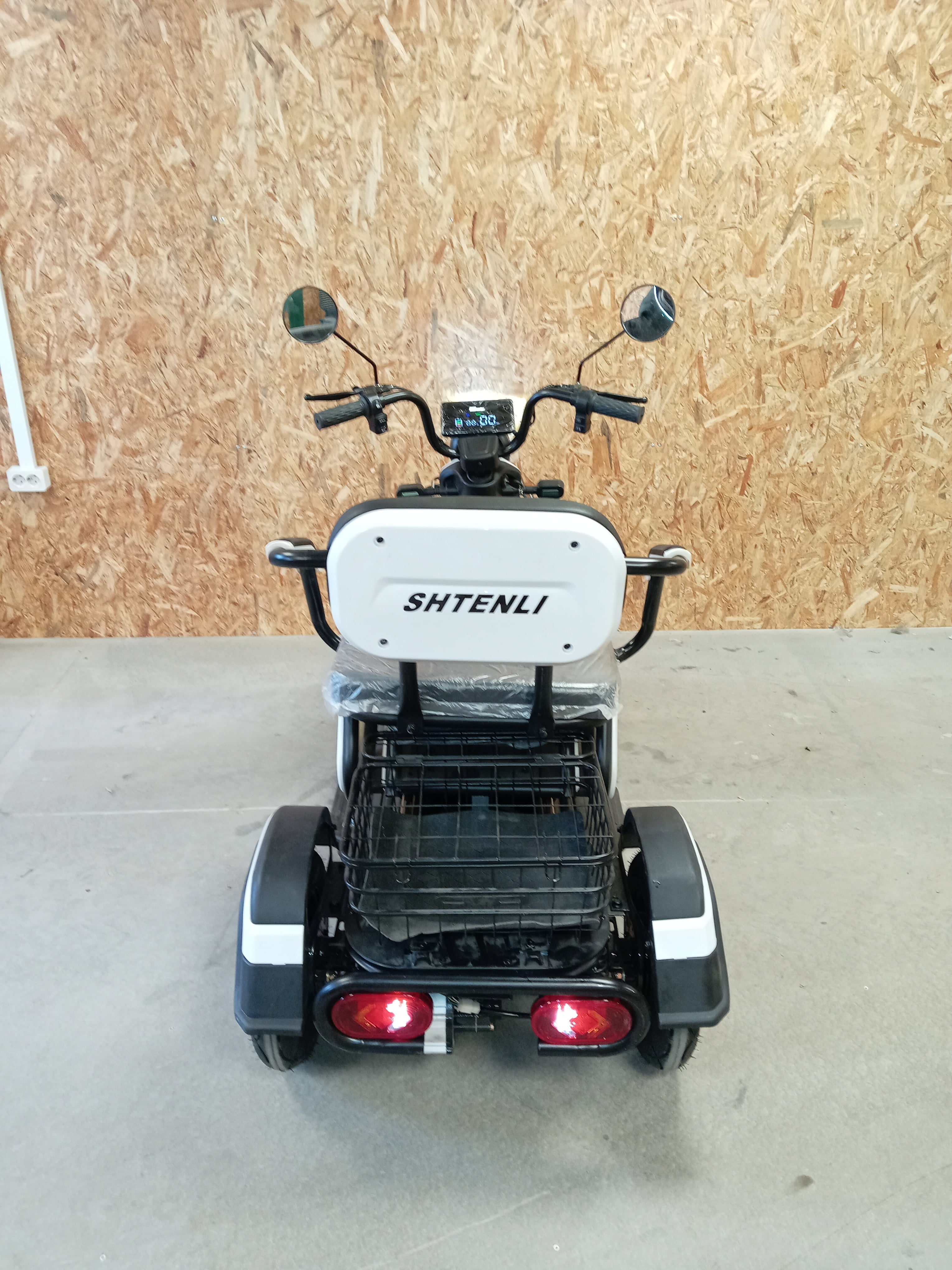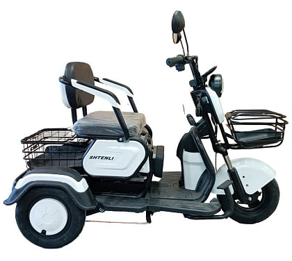 Трехколесный электроскутер Shtenli Model 31 - это трехместный электроскутер трицикл с аккумулятором 48v20Аh и мощным мотором на 750W. Его дальность пробега до 40 км.