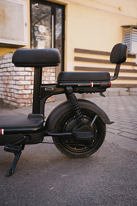 • амортизация передней и задней оси; энергоэффективный электромотор; боковая подножка;