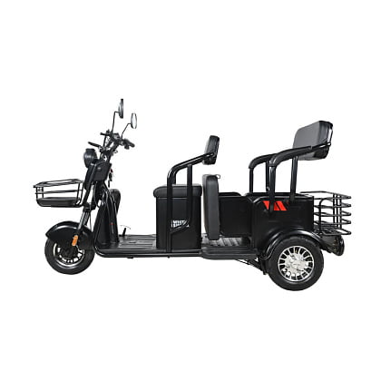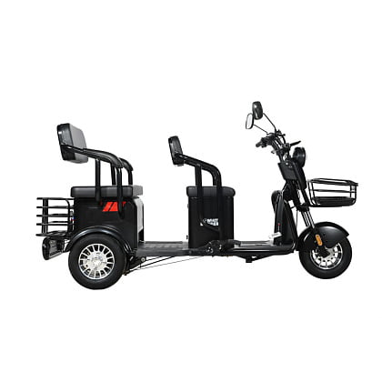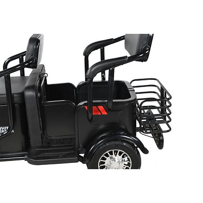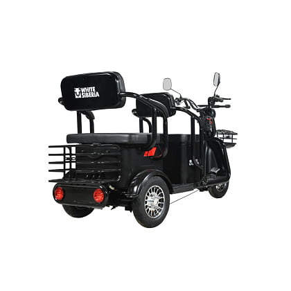 - Универсальное транспортное средство. На WHITE SIBERIA SIBTRIKE 2000W сможет уместиться до 3-ех людей. Так же имеется детское сиденье с дополнительным ручным держателем ребенка. Большое сиденье может сдвигаться вперед, а с передней части присутствует небольшое откидное сиденье. Под вторым сиденьем размещается подседельное пространство 40 литров, а так же в задней части рикши вы сможете заметить большую сетку-кофр. Таким образом вы сможете перевозить колоссальное количество товара и вещей, что делает WHITE SIBERIA SIBTRIKE 2000W вне конкуренции среди других трициклов.