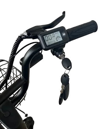На руле расположен эргономичный информационный дисплей который отображает уровень заряда батареи, пробег, скоростной режим, там же на руле есть звуковой сигнал, ручка газа.