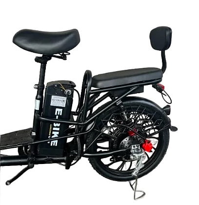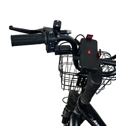 Электровелосипед оснащен вместительной корзиной спереди.