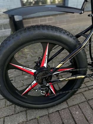 Модель оборудована мощными колесами размером 26” с широкими мотоциклетными шинами 4.0 дюйма, которые обеспечивают отличный сцепление с дорогой. Такая резина не только эффективно смягчает удары, но и помогает легко справляться с песком, грязью и льдом, делая поездки безопаснее в любых погодных условиях.