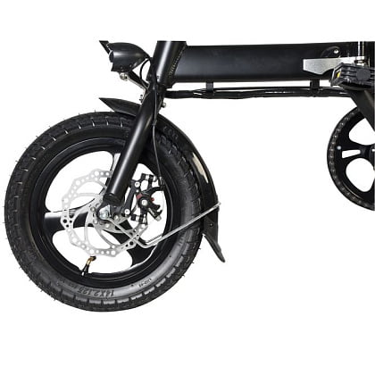 - Электровелосипед оснащен колесами диаметром 14 дюймов с бескамерной шиной. Для езды в темное время суток производитель укомплектовал данную модель яркой передней фарой, светящимся задним габаритом, и набором катафотов.