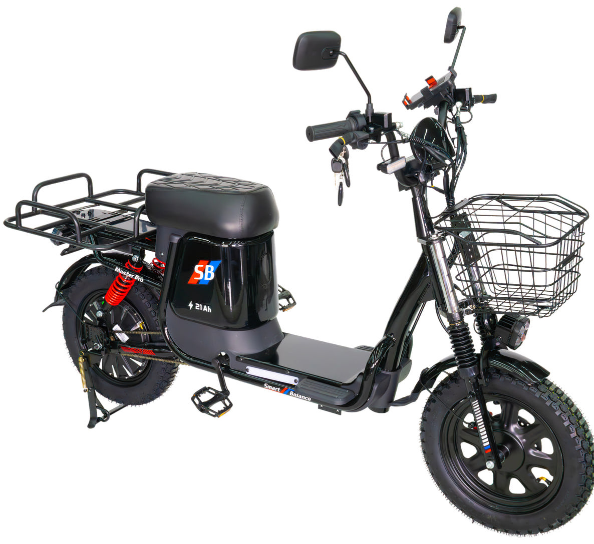 Электровелосипед SmartBalance Master Pro — это электровелосипед, сочетающий высокую мощность и максимальный комфорт. Он оснащен просторным багажником и корзиной, что делает его идеальным как для курьеров службы доставки, так и для перевозки личных вещей.