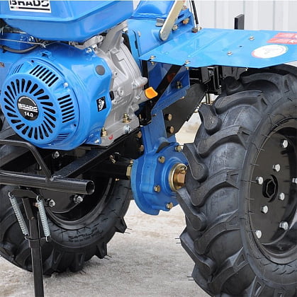 Мотоблок Brado BD-1400 обладает большим количеством преимуществ. Он оснащается мощным, но экономичным двигателем. Трансмиссия отличается высокой надежностью и позволяет более оптимально использовать мощность мотоблока. Большие колеса с выраженным протектором будут надежно цепляться за любые виды грунта.