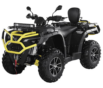 Размеры квадроцикла — 2200×1180×1270 мм, колёсная база — 1370 мм, высота сиденья — 900 мм, дорожный просвет — 280 мм. Просторный салон рассчитан на двух человек, что делает поездки приятными для водителя и пассажира. Минимальный радиус поворота — всего 8 метров — позволяет легко маневрировать в ограниченных пространствах.
