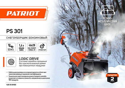 Снегоуборщик Patriot 301 - легкий и компактный снегоуборщик, оснащенный 4-тактным бензиновых двигателей мощностью 3,5 лс, станет незаменимым помощником при уборке снега с приусадебных участков, троутаров и придомовых территорий.